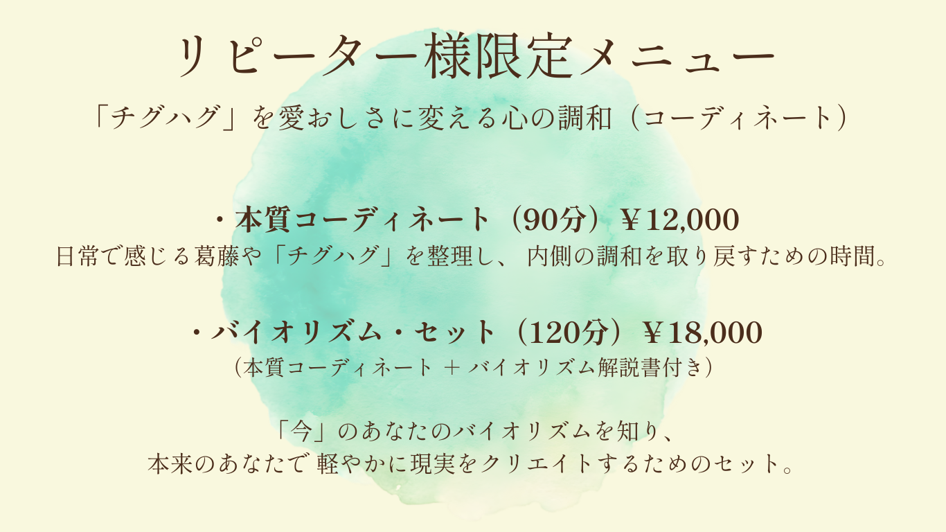 バイオリズムセッションを先ほどの「本質コーディネート」とお得なセットメニューとしまして、